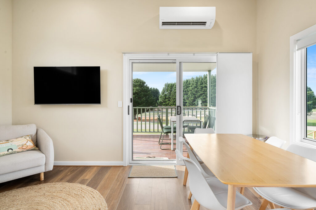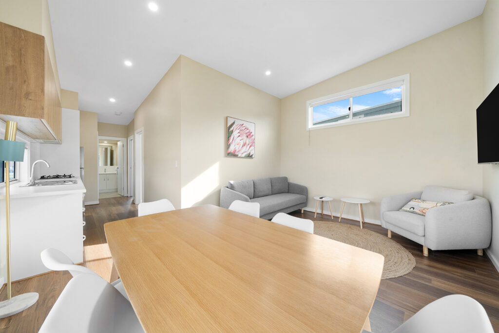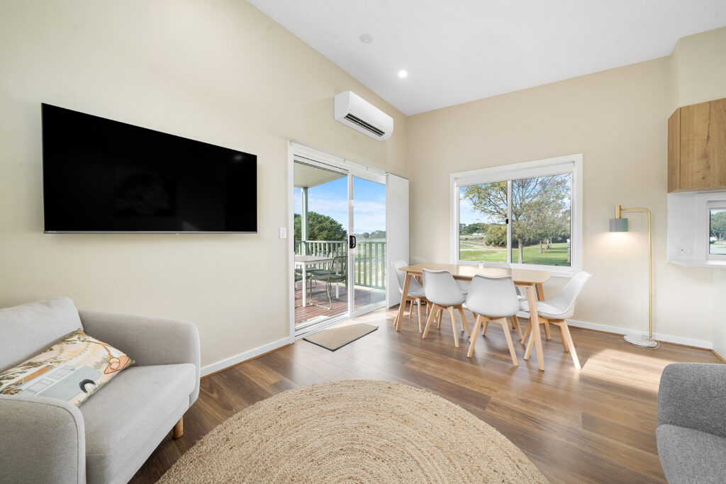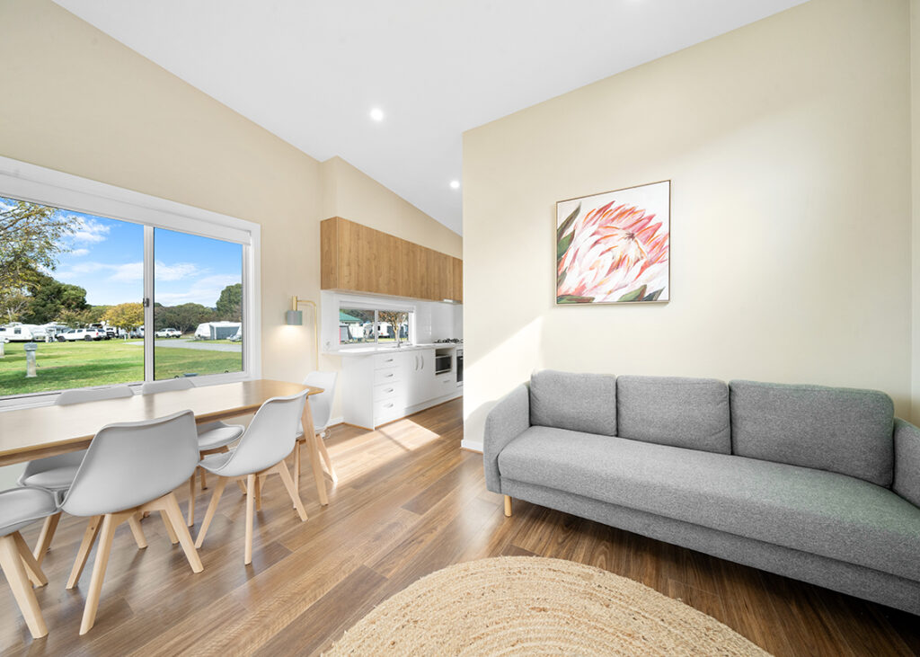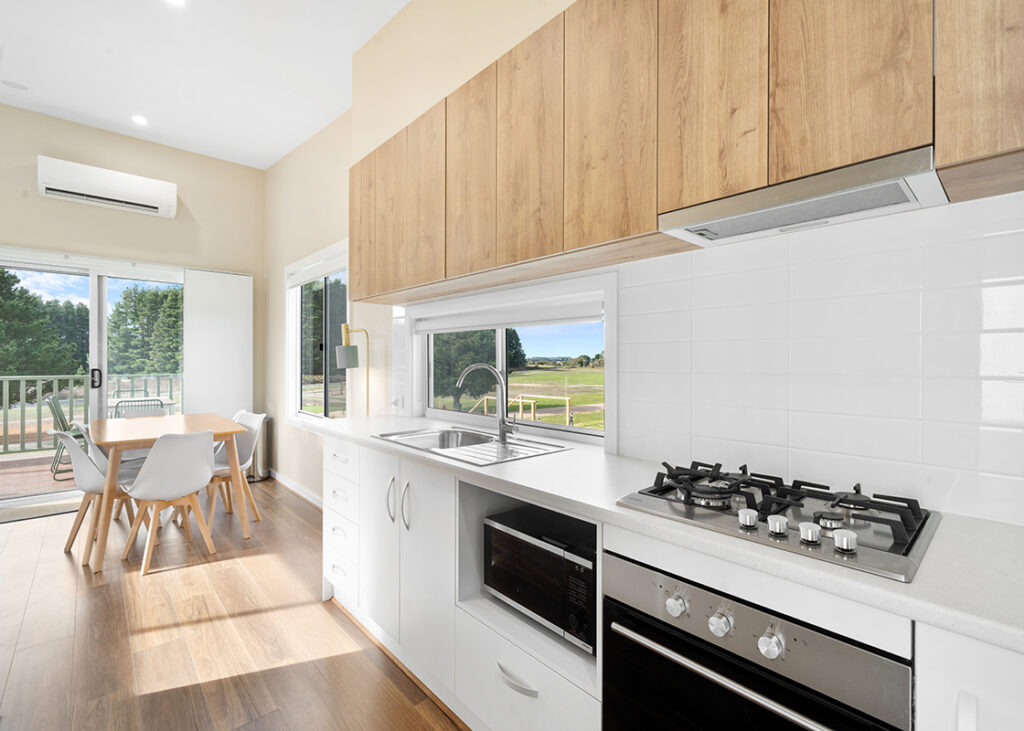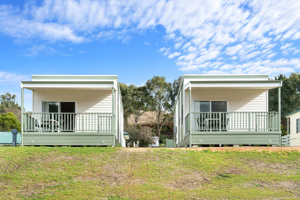Built on site at Mount Compass Caravan Park, these two cabins feature our popular two-bedroom configuration and are designed to blend seamlessly with the park’s existing facilities. With the living space positioned at the front to take in the sweeping countryside views, each cabin includes a sleek single-wall kitchen and contemporary finishes, delivering comfortable accommodation that sits naturally within its surroundings. The exterior is finished in James Hardie Primeline weatherboard cladding and Colorbond accents for a visually dynamic look.